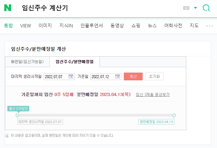 쉽고 빠르게 나의 임신주수를 확인할 수 있는 방법은 없을까요? 당연히 있죠! 네이버 검색창에 임신주수 계산기 또는 분만예정일을 검색해 보세요. 자동으로 계산기가 뜰 거예요. 마지막 생리가 시작된 날짜만 정확히 입력하면, 번거롭게 계산할 필요 없이 자동으로 분만 예정일과 현재 임신주수가 나옵니다. 생리 주기가 규칙적인 분들이라면 이 방법이 아주 정확한 임신주수 계산기 역할을 할 거예요. 하지만 생리 주기가 불규칙한 경우엔 7~15일 정도의 오차가 생길 수 있으니, 네이버 임신주수 계산기는 참고만 하시고 정확한 확인은 꼭 병원에서 하셔야 합니다!